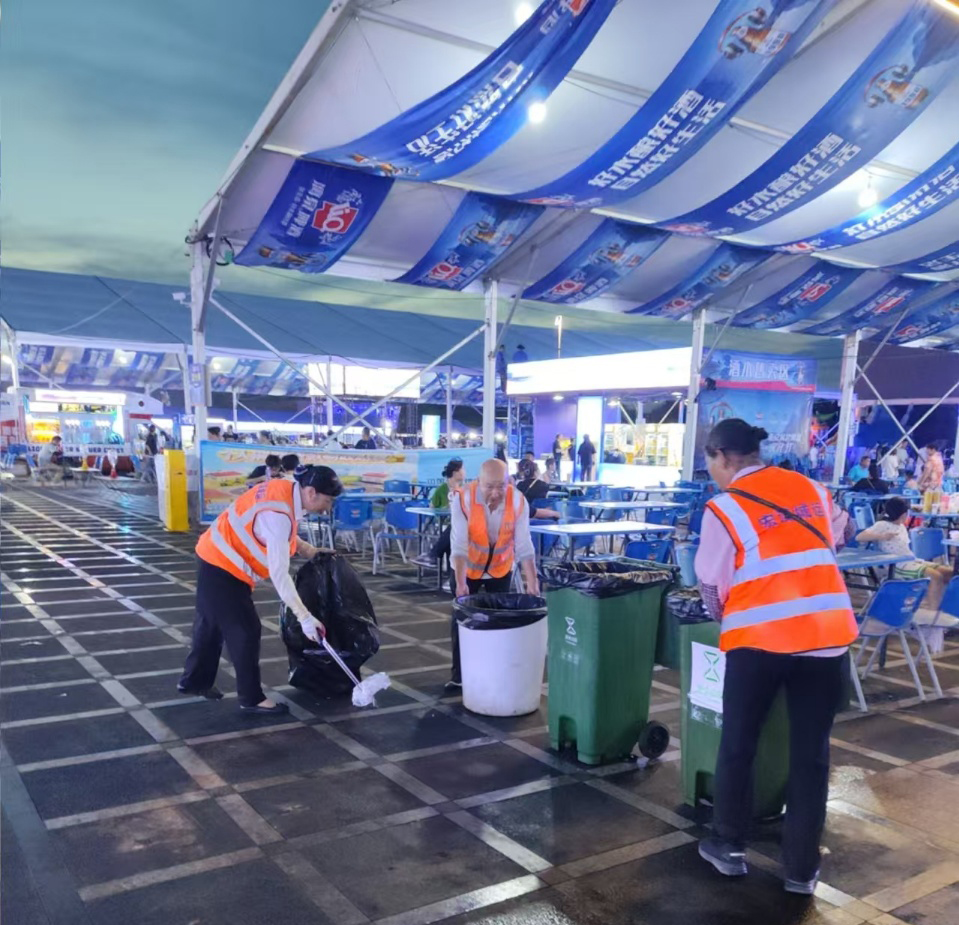 垃圾清运:13天累计清理垃圾约2600袋(日均200袋),餐饮垃圾定点清运,烟花秀废弃物散场1小时内清理,无堆积滞留。