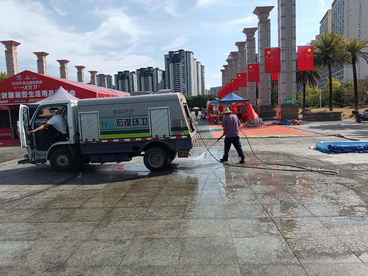 现场清洁:环卫清洗车每日早晚高压清洗地面,清除油污污渍,保障环境整洁。
