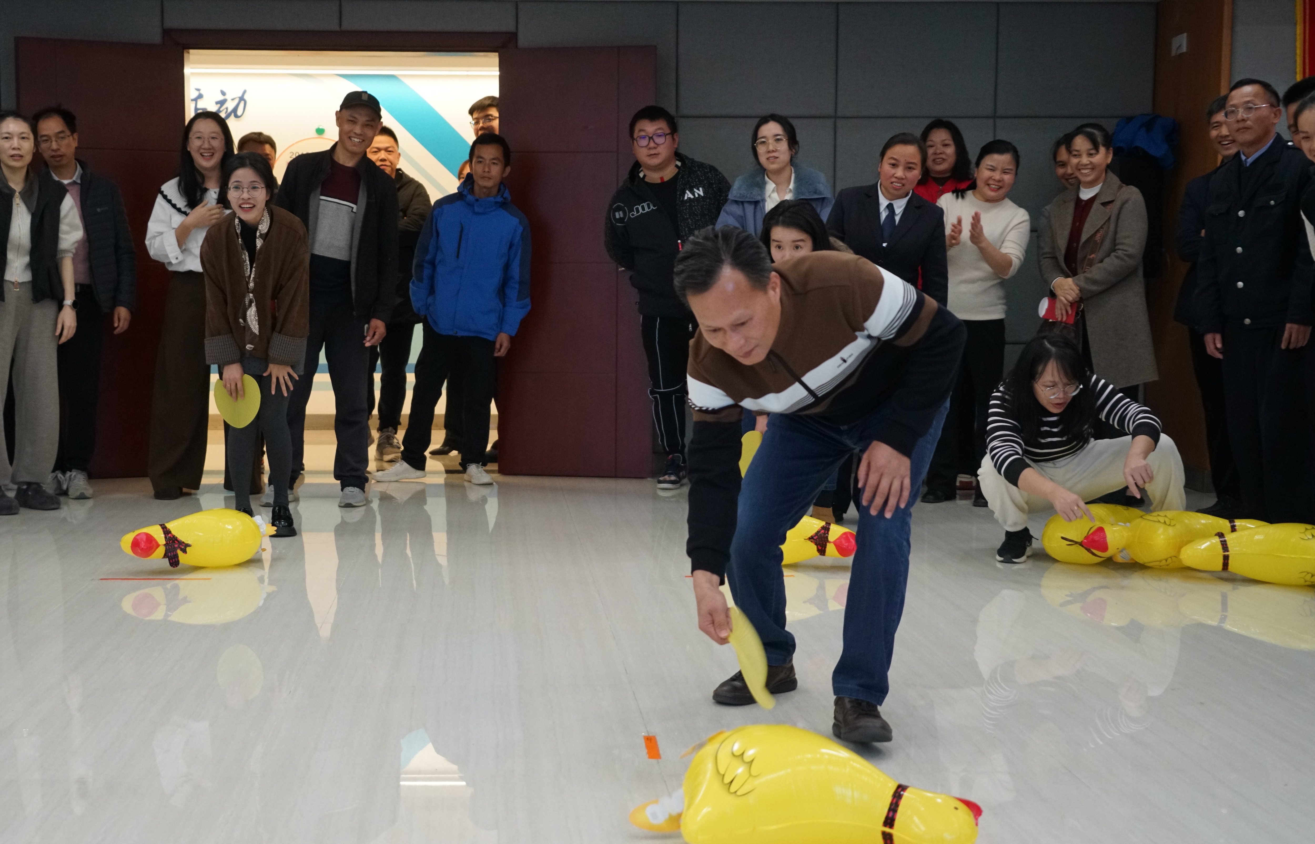 “赶鸭子上架”游戏中,队员们手持蒲扇,对着圆滚滚的气球鸭子“各显神通”,小鸭子们时而听话前行,时而突然“拐弯”。这场充满不确定性的协作挑战,把紧张感和趣味性拉满,欢乐值一路飙升!