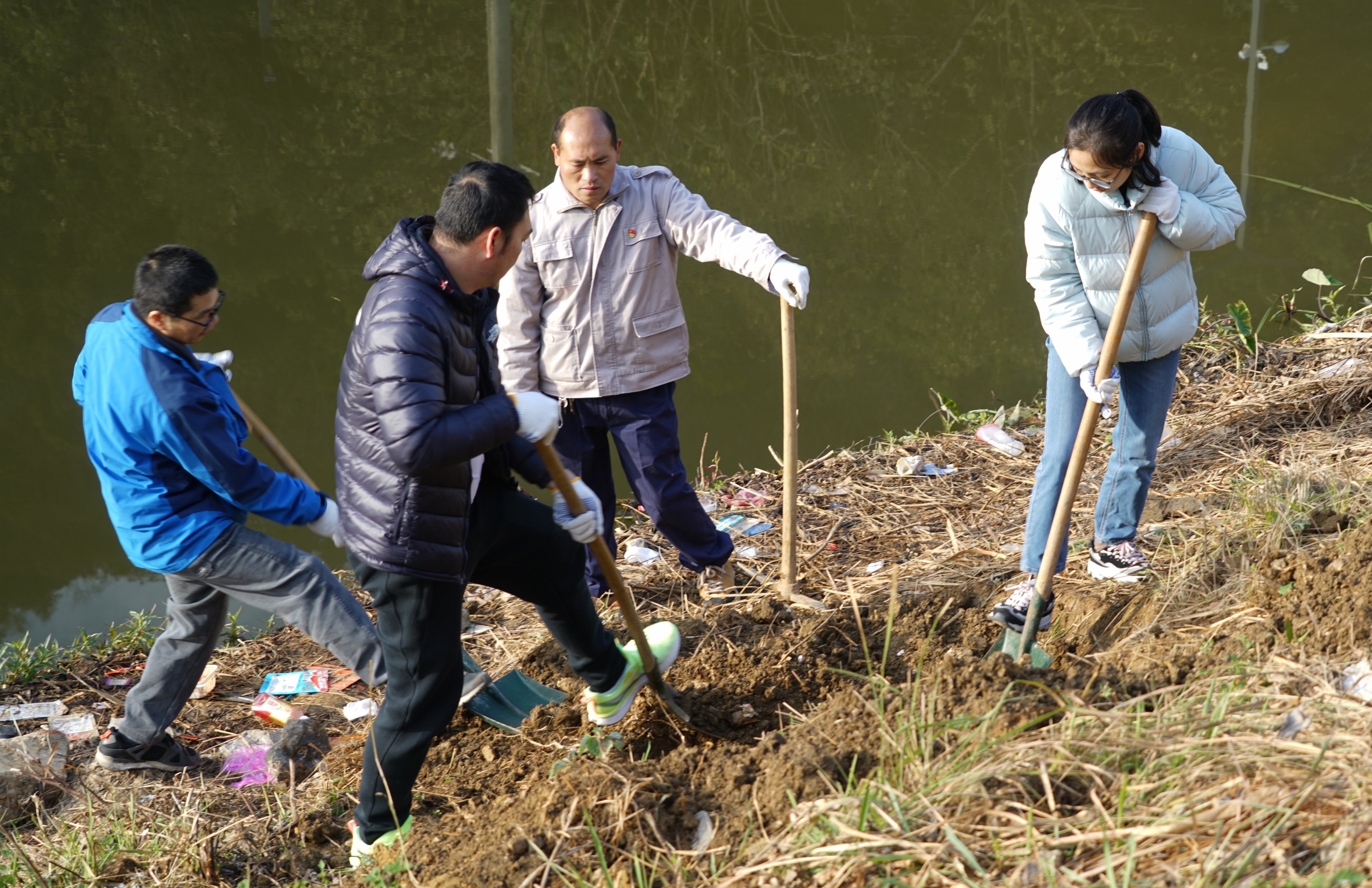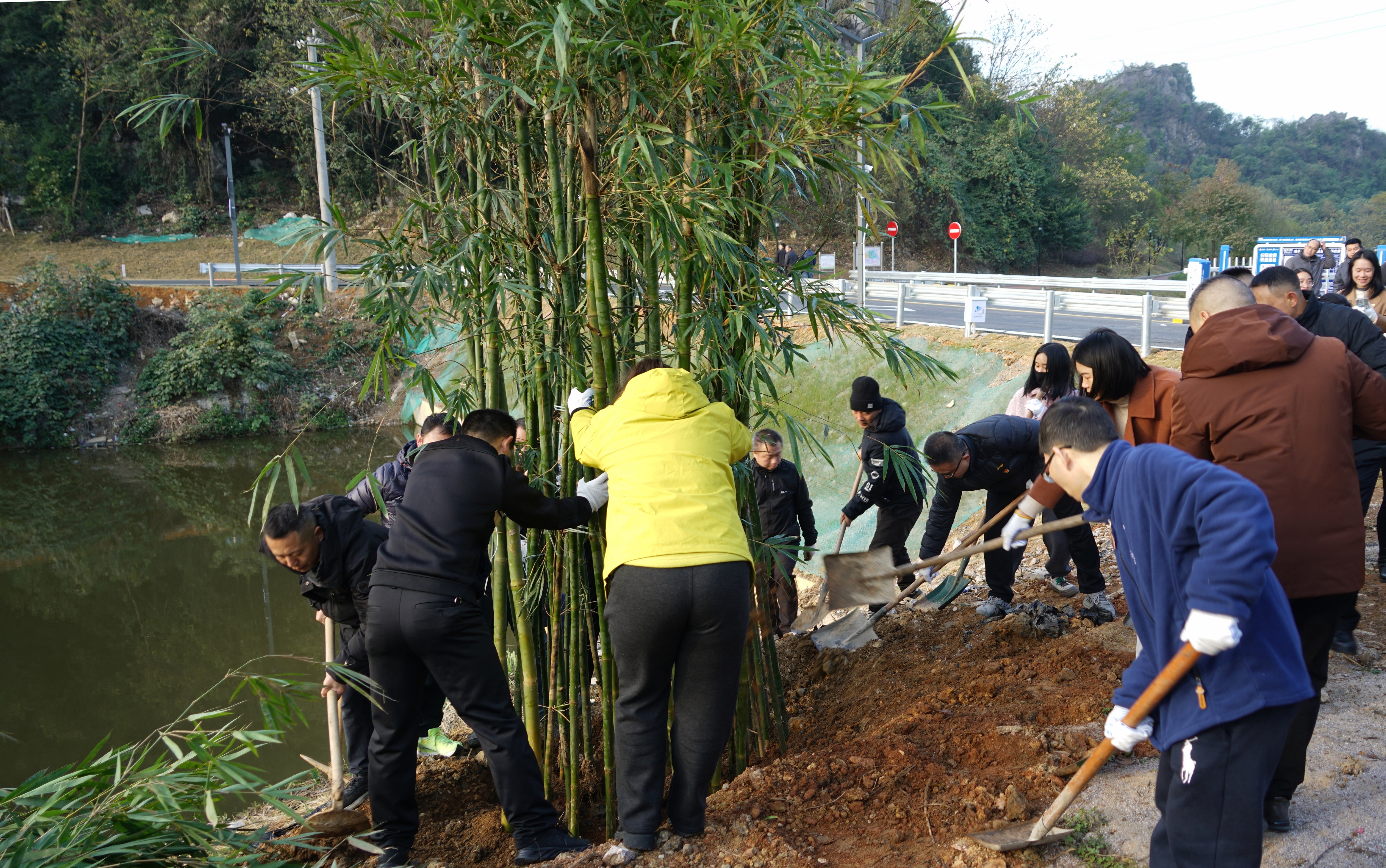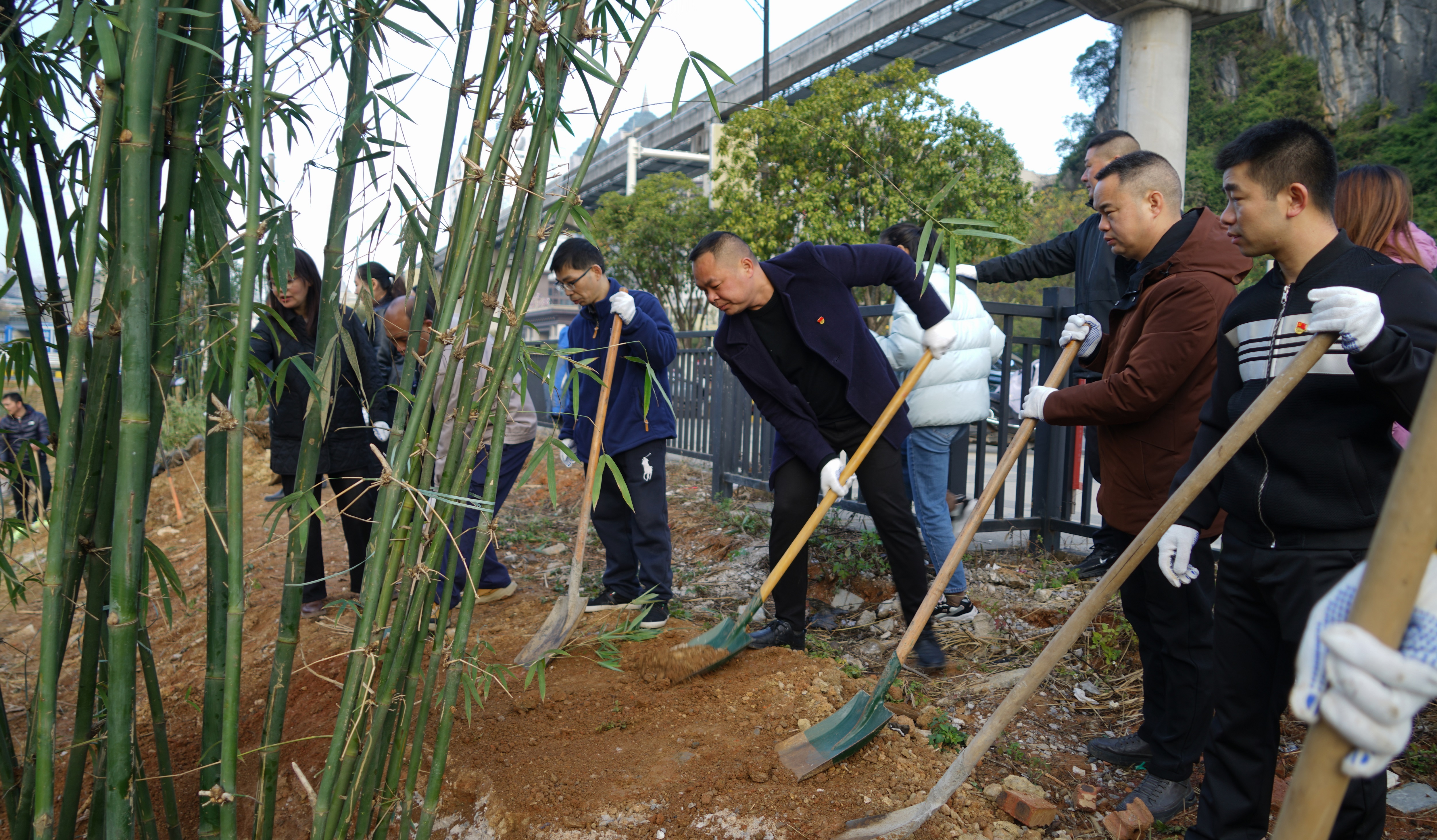 随后,种竹添绿核心环节正式启动,在宏谋城运公司工作人员的专业指导下,大家迅速分工、默契协作:有的搬运竹苗、有的挥锹挖穴、有的扶苗定植、有的培土压实,每一个动作都认真细致、有条不紊。